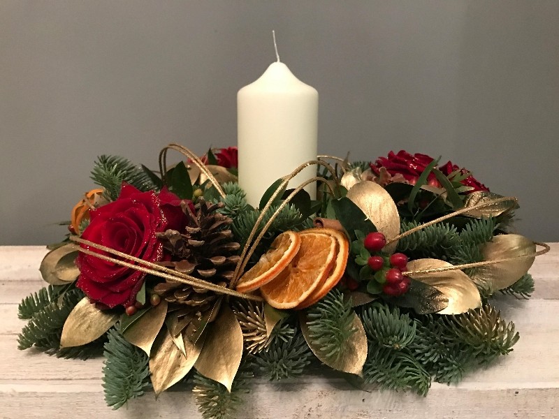 A festive candlelit design to brighten any Christmas table, abundant with blue spruce - shown with red berries, cones, fruit slices and red roses.