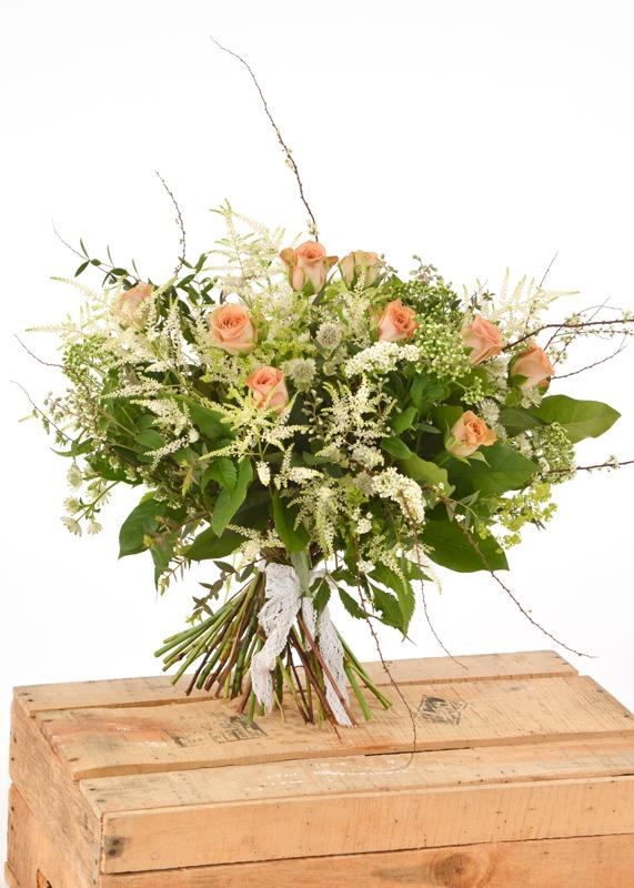A vintage style hand-tied incorporating astrantia, birch twigs and stunning pink or peach roses. Elegantly presented in beautiful gift packaging, hand-written message in a water bubble for ease of gifting.
