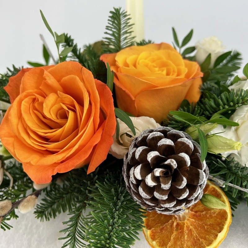 You choose! Shown is our fresh "Snowy Grove" table centre featuring simple, classic whites and greens with festive pine cones and a hint of orange and citrus fruits.