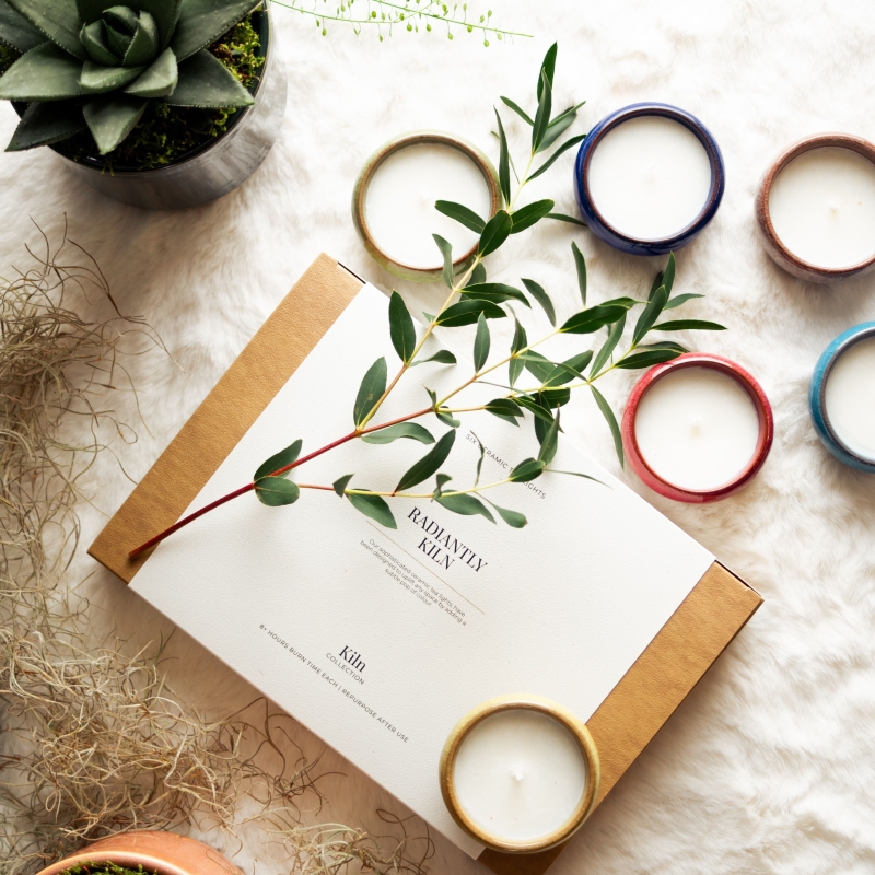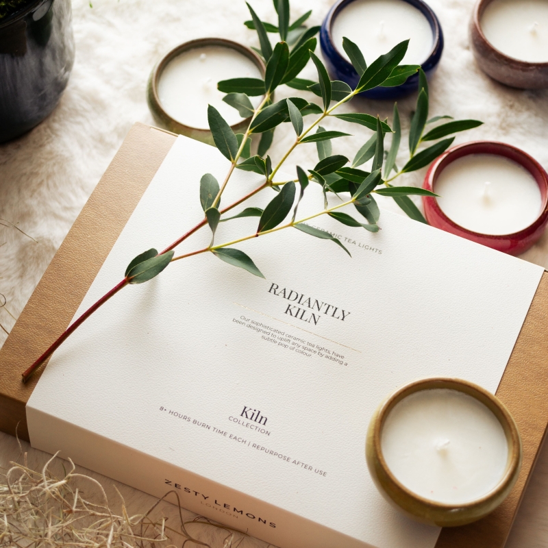 From the design house Zesty Lemons, a deluxe gift box - nestled in the tissue are 6 ceramic Kiln tea lights in the most gorgeous array of colours.