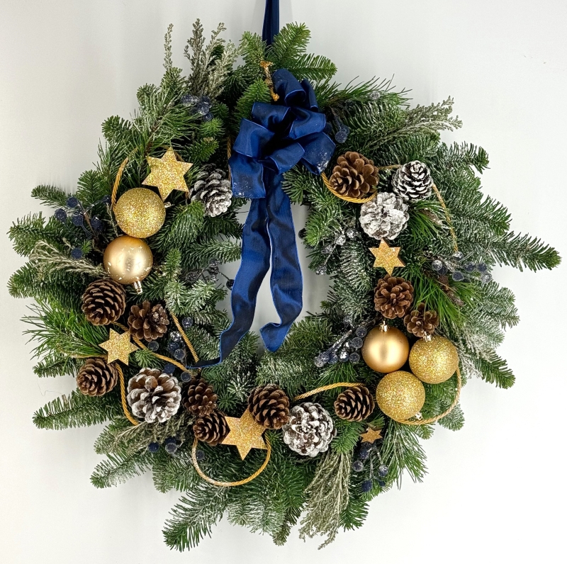 Celestial whites, golds and midnight blue elements adorn our Starry Night Wreath.