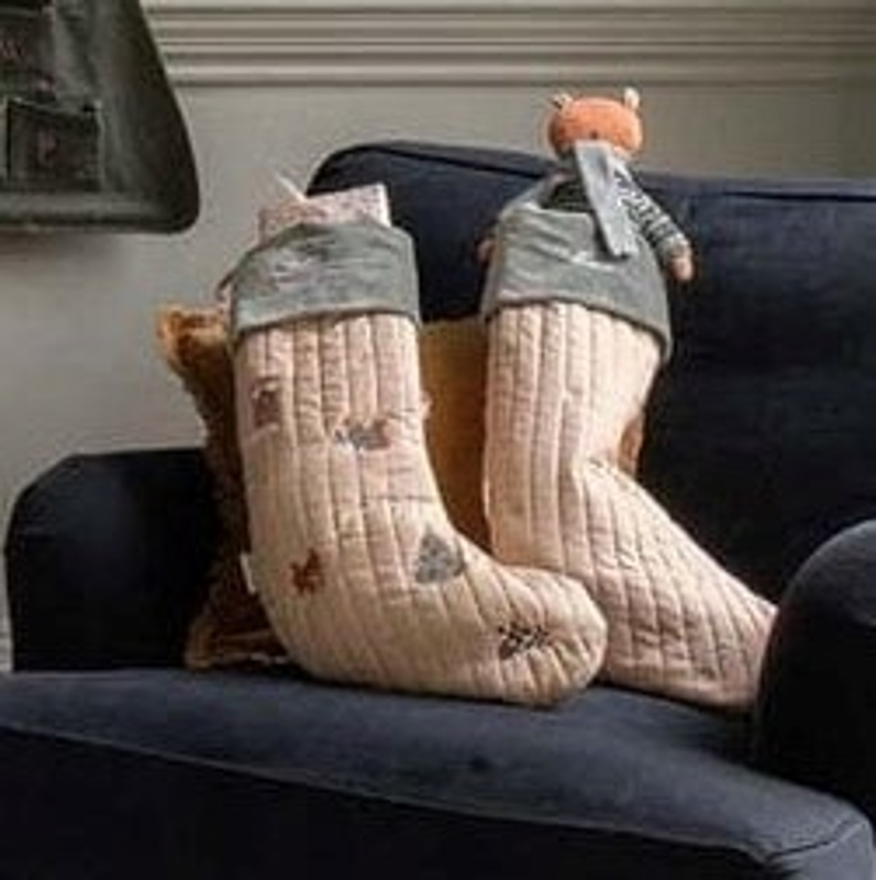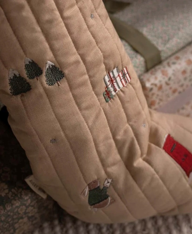 A beautifully made, lightly quilted organic "Festive Forest" stocking with charming embroidered motifs and a luxuriously velvety sage green cuff.